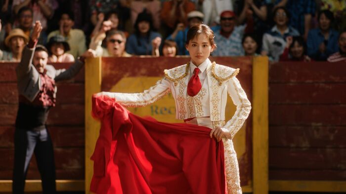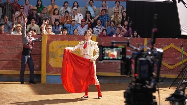 先生からまずマントの扱い方を教わり、牛をかわすシーンに臨みます。本番時では真剣な眼差しで臨んでいる表情から一変して、カット後に笑顔になるギャップが印象的なシーンとなりました。