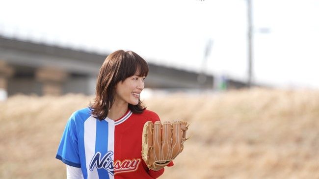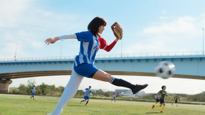 野球とサッカー半々のユニフォームで登場した綾瀬さん。そんな特殊な衣装を着こなし、野球プレイヤー、サッカープレイヤーとして登場したエキストラたちも見守る中、野球のダイビングキャッチやサッカーのシュートシーンを華麗に決めていきます。