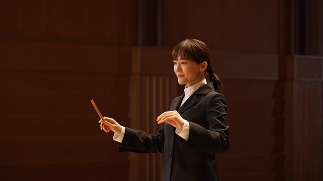 2つ目のシーンでは、指揮者役として指揮に挑戦する綾瀬さん。先生から指揮棒の振り方を教わり、指揮のシーンに臨みました。