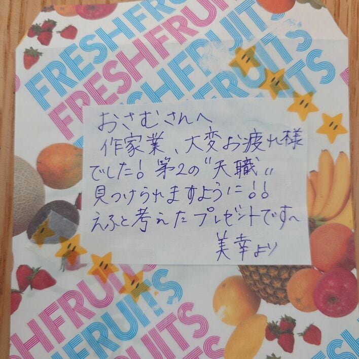 投稿には妻・大島さんから「作家業、大変お疲れ様でした!第2の“天職”見つけられますように!!えふと考えたプレゼントです~」と愛情がこもった手紙の写真が添えられていました。
