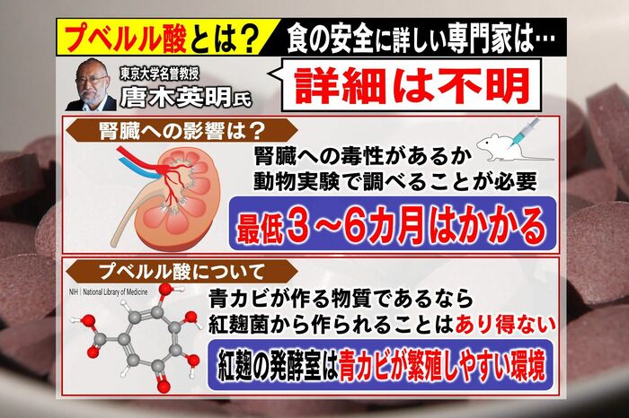 食の安全の問題に詳しい東京大学の唐木英明氏は、「プベルル酸」という物質が小林製薬からではなく、厚生労働省から明かされたことに問題があると話します。