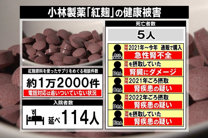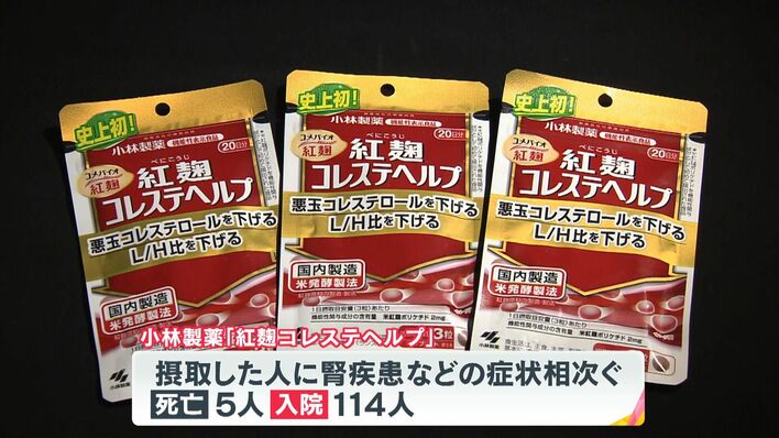 これまで小林製薬の「紅麹コレステヘルプ」を摂取した人に腎疾患などの症状が相次ぎ、5人が死亡。114人が入院した問題。