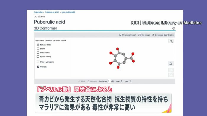 厚労省によると、「プベルル酸」は、一般的に青カビからつくられる天然化合物で、マラリアに効果があり、毒性が非常に高いといいます。