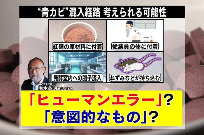 唐木氏は、プベルル酸が厚労省のいう「青カビが作る物質」であるならば、紅麹菌から作られることはあり得ないため、紅麹の発酵室は青カビが繁殖しやすい環境にあったのではないかと推測。