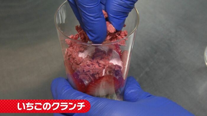 クリームの上には、ピスタチオといちごのスライスを敷き詰め、いちごのクランチをかけています。