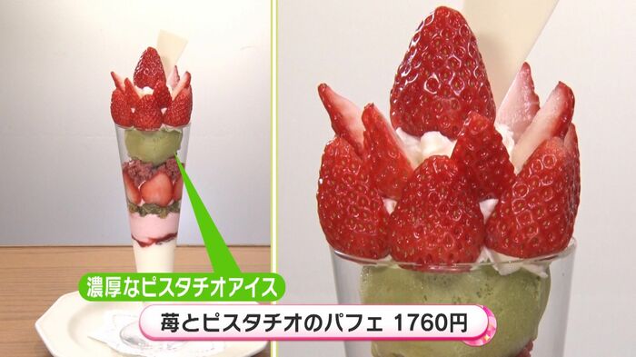 イチオシはいちご尽くしのパフェ。見た目だけでも食べる前にテンションが上がります。