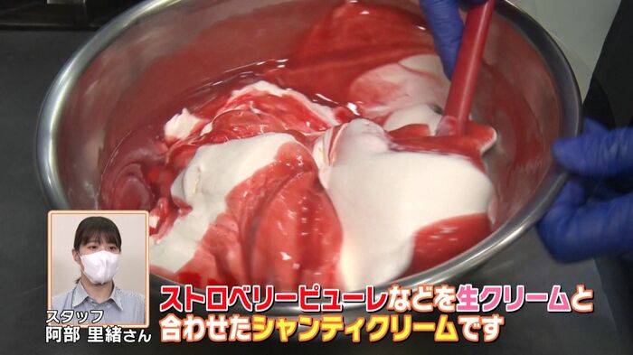 泡立てたふわふわの生クリームにストロベリーピューレを合わせて、口溶けの良い甘酸っぱいクリームに仕上げています。