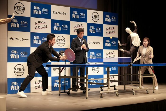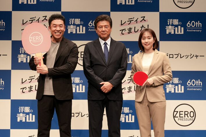 なかやまきんに君、石川佳純さん、三浦友和さんが3月28日、「洋服の青山 ゼロプレッシャースーツ」新CM&新キャラクター発表会に出席しました。