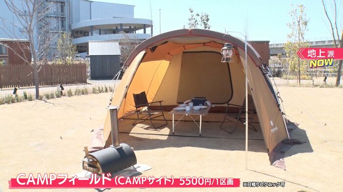 芝生エリアは飲食の持ち込みが可能で、シートを広げてピクニックだけでなく、キャンプも一区画5500円で楽しめます。