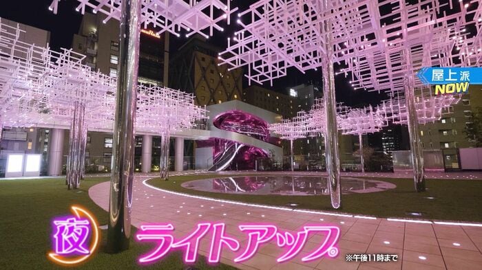 きれいに整備された芝生と共におしゃれなポールが立ち並んだ空間は、渋谷らしい近未来的で最先端な空気をまとっていました。夜になると、ポールは桜をモチーフにしたピンクでライトアップされ、夜桜を楽しめる幻想的な世界へ没入できます。