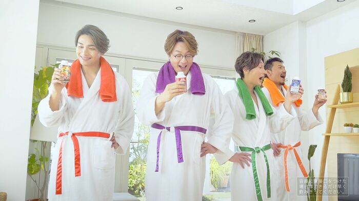 純烈のお風呂上がりシーンや、バスローブ姿で堂々と「ゴクうまボトル」を飲む姿に注目です。