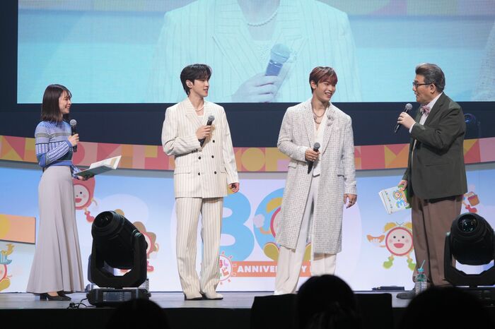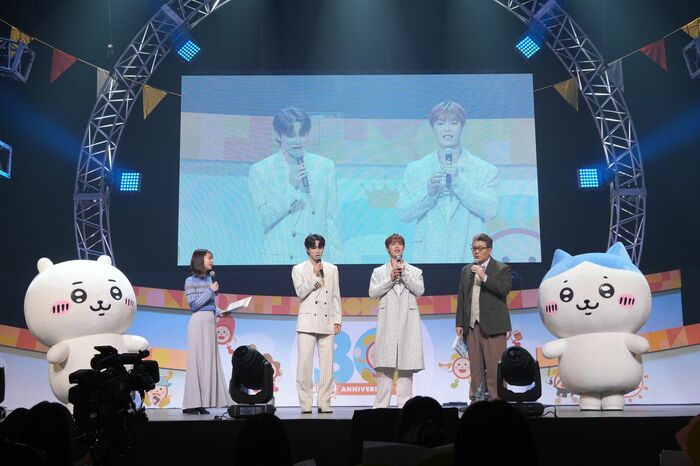 軽部真一フジテレビアナウンサー、鈴木唯フジテレビアナウンサー、ちいかわとハチワレがステージに集合し、歌い終わったばかりの2人が加わってトークパートへ。初となる2人でのイベント出演に、「緊張しましたが、会場のみなさんがあたたかかった!」(河野さん)、「11人の曲を2人で歌うとすごくお腹が空く」(與那城さん)と吐露。2人とも緊張から解放され、ホッとした表情になっていました。