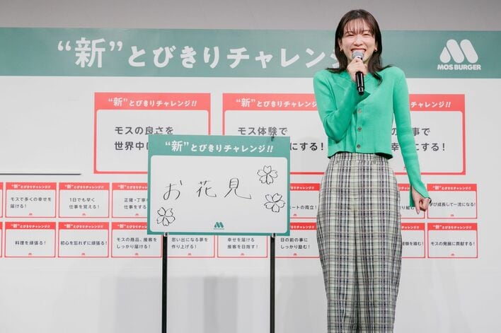 新入社員から、「モスの良さを世界中に広げる!」「人を幸せにする!」などの規模の大きな回答が出たことに、永野さんは「ちょっと待ってくださいね。この流れでこれはちょっと違ったかも…」と不安そうな様子。そして、自身の回答を「お花見」と発表。