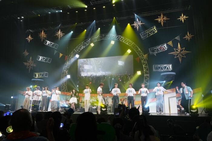 4曲目はロックチューンの『気分爽快』。サビの「飲もう♪」の箇所では、会場も両手を上げて横揺れで一体感を作り出し、誰もが知る大ヒット曲の連続に盛り上がりは最高潮。森高さんは、「みなさん、飲もう♪ってやってくれてありがとうございます。みんなもいい笑顔していますね」と笑顔を見せ、ラストの曲に進む前に、「今日は特別に」と、ゲストを呼び込みます。めざましくんアロハ姿の岡崎さん、フェスTシャツ姿のM!LK、FANTASTICS、JO1の河野さんと與那城さんが集まり、豪華なメンバーで『ララ サンシャイン』!