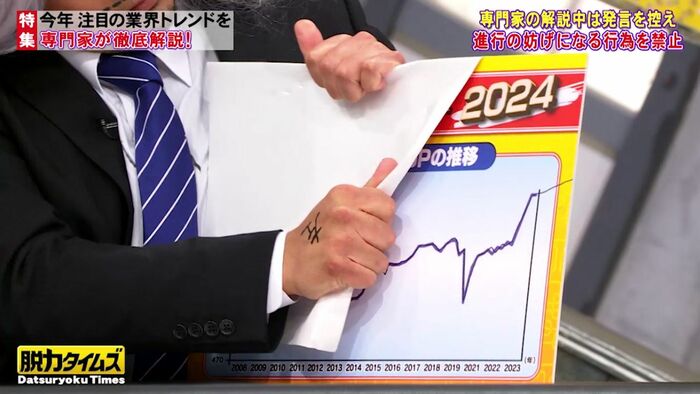 さらに「GDPも回復 経済正常化に伸びしろアリ」をテーマに解説するはずが、衣休先生は折れ線グラフをマジックでただなぞるだけで、フリップから外れて自身のワイシャツまではみ出したり…。