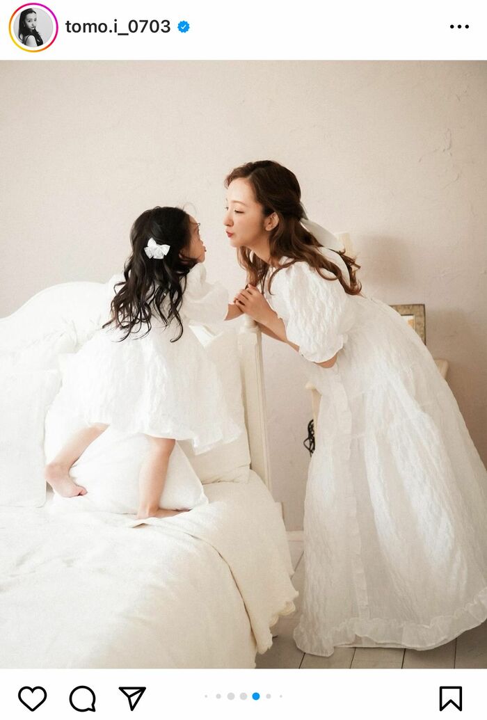 ピンクや白など様々な色のドレスを着用し、中には娘“ベビちん”が板野さんにキスをしているようなショットも。