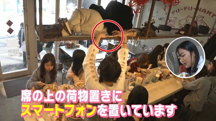 料理が運ばれてくると、テーブルの上にある荷物置きに、画角を気にしながらスマホを置いている女性を発見!