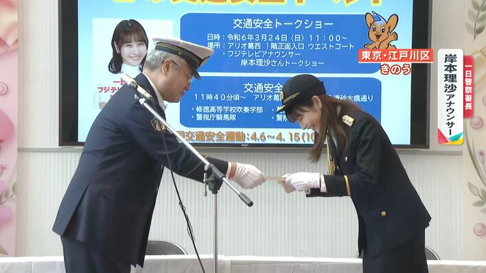 春の全国交通安全運動を前に3月24日、フジテレビ 岸本理沙アナウンサーが、警視庁葛西警察署の一日署長に任命されました。