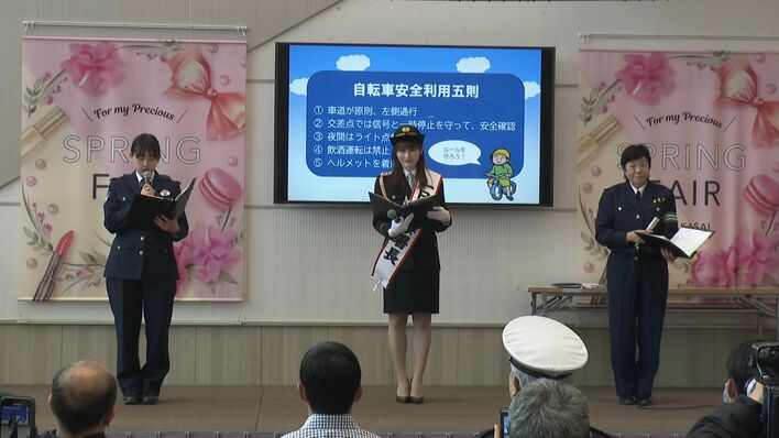 任命式の後、東京・江戸川区のショッピングモールで、努力義務となった自転車のヘルメットの着用を訴えた岸本アナ。