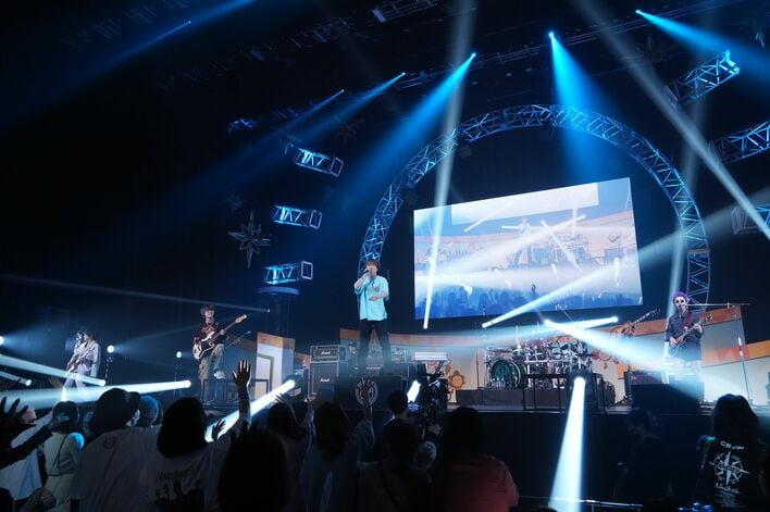 スクリーンに、Novelbrightの『めざましテレビ』出演時の紹介VTRが流れると、客席ではバンドタオルを首にかけたファンが立ち上がり手拍子をしてメンバーの登場を待ちわびます。竹中雄大さんの叫び声が響き、1曲目『Sunny drop』でライブがスタート。「楽しんでいこうぜ!よろしく!」と叫び、伸びやかなボーカルで会場のテンションを上げていきます。