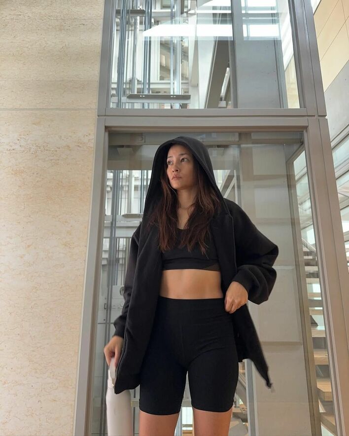 トレーニングウェア姿を公開し、引き締まった美腹筋とスラッとした美脚を披露しました。