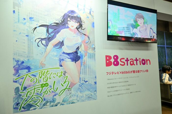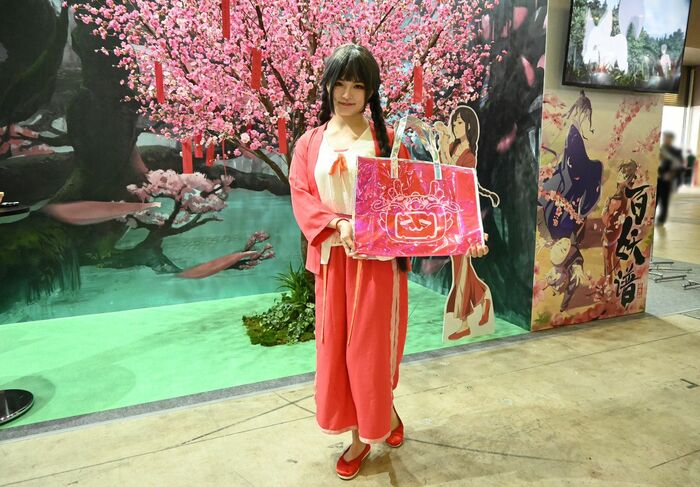 中国の動画配信サービス「bilibili」ブースでは、現在フジテレビ「b8station」枠で放送中の『百妖譜』のコーナーが。アニメのビジュアルを再現したピンク色の花が、ひときわ華やかに彩っています。主人公・桃夭に扮した女性も、会場を盛り上げていました。