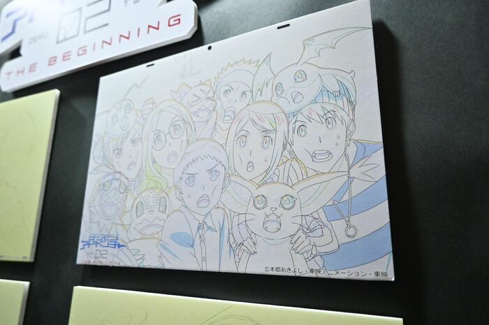 「グラフィニカ×ゆめ太カンパニー」ブースでは、『デジモンアドベンチャー02 THE BEGINNING』の原画が展示されています。繊細な筆跡から、1枚1枚丁寧に描かれていることがうかがえます。