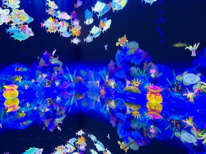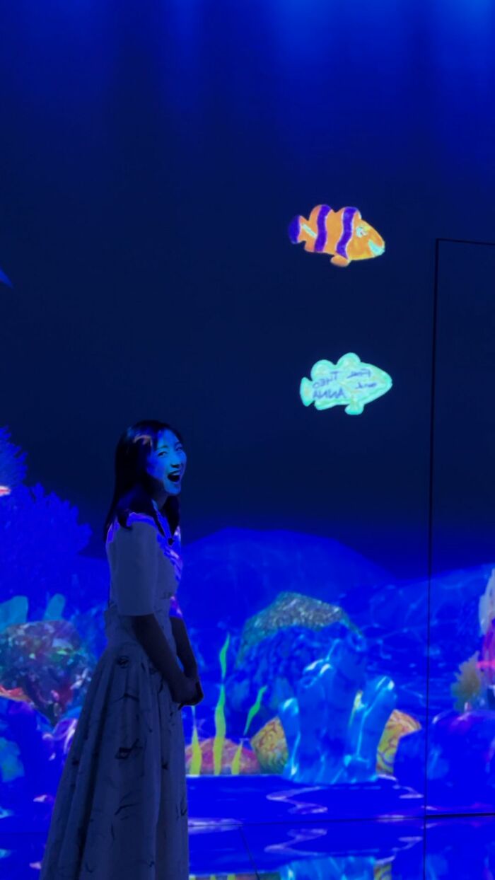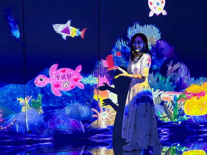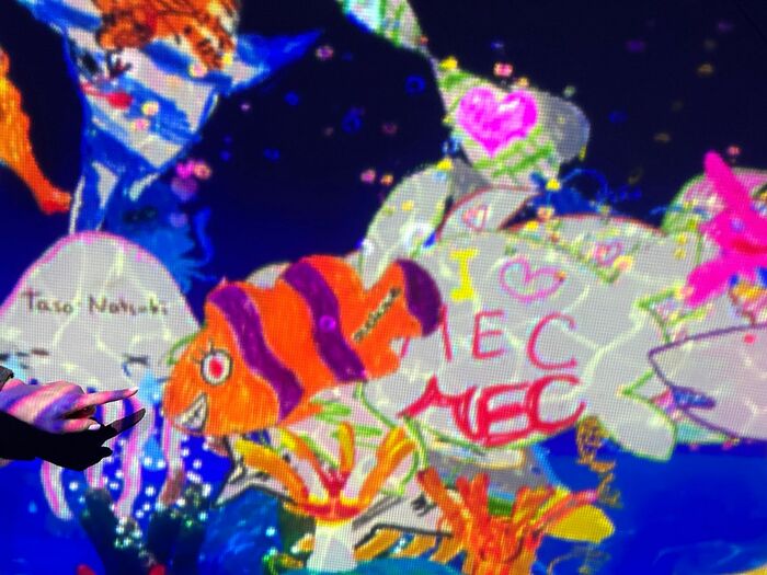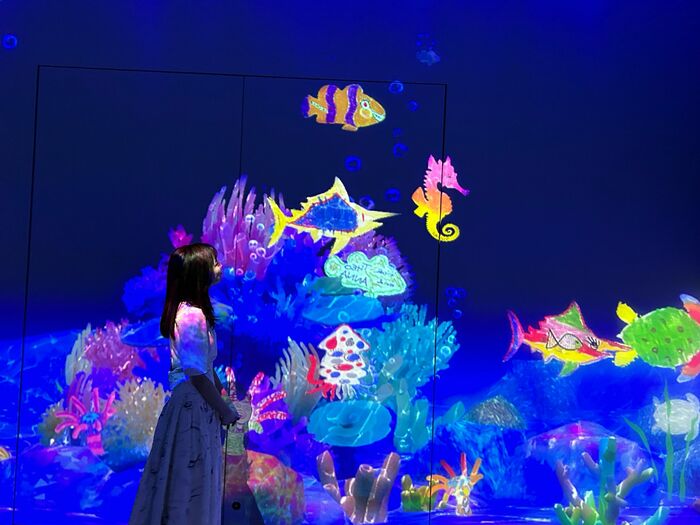 自分のアートをみんなに披露したい方には『スケッチオーシャン』がおすすめ。来場者が描いた魚がデジタルスクリーンの海に泳ぎ出す、という楽しい作品です。