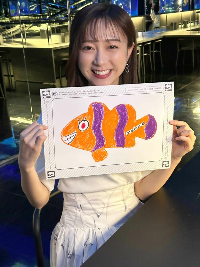 佐久間アナも“マイお魚”描きに挑戦。目はフジテレビのめんたまマーク、他の魚に埋もれないように歯はギザギザにして、色もカラフルにして、melanie(メラニー)というニックネームを入れました。