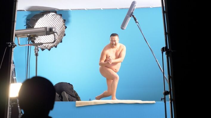 “全裸ポーズ”をキープしたまま倒れるという、通常とは異なるポーズのため、体の角度を微調整しながら何度もトライしていました。