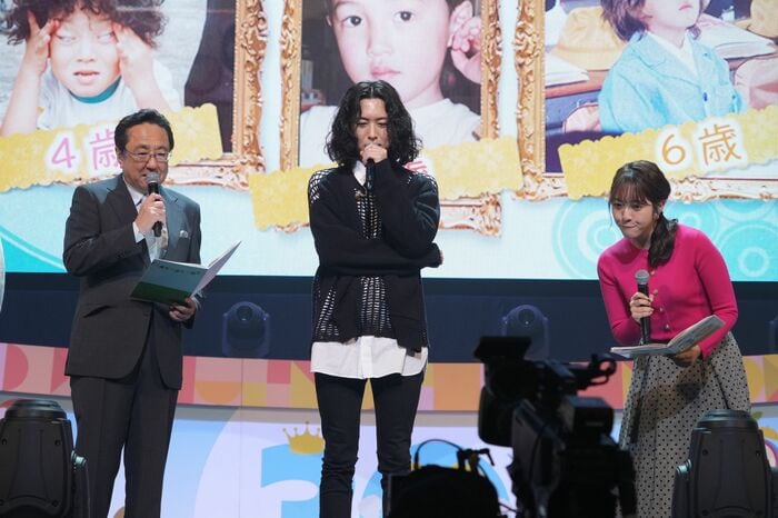 めざましフェス恒例の、「30周年にちなんでアーティストの30年前の写真を紹介」するコーナーでは、キタニさんが現在28歳ということで、幼少時の写真3枚がスクリーンに投影。幼稚園児の頃の鬼の角をつけて変顔を決めている1枚には、「節分イベントでみんなはアフロのかつらと鬼のパンツを履いていたけど、僕だけ天然パーマなんで地毛で」とコメント。
