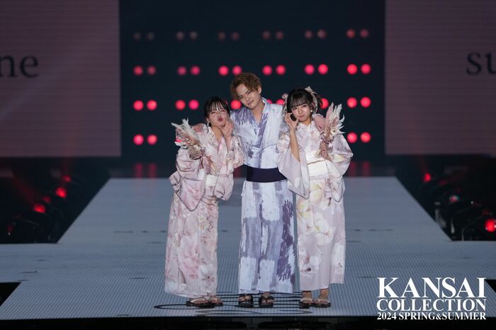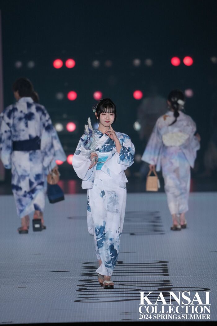人気急上昇中の5人組ラップユニット「博多4K」のラップに会場が沸く中、ランウェイに登場したのは鈴木さん。白地に大きな青い花があしらわれた浴衣姿は、早くも夏らしさを感じられ、大人っぽい雰囲気で観客の視線を集めていました。