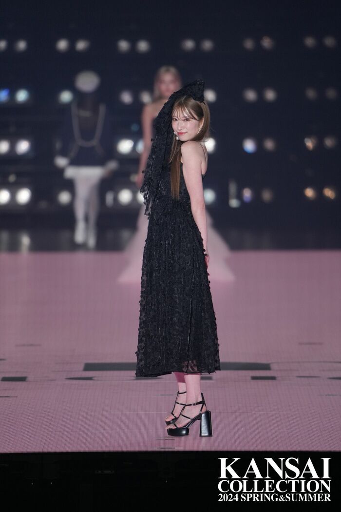 吉田さんは、透け感のある黒のワンピースを着こなしウォーキング。頭に付けた大きなリボンも吉田さんのかわいらしい表情を引き立てます。