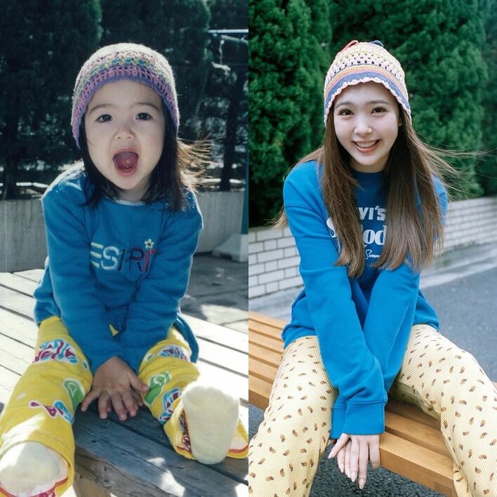 藤田さんは「ニコホリの連載にて。」とコメントし、幼少期と現在の自分との比較ショットを公開。服装は色味などは若干違うものの、なるべく似たものを着ており、表情まで再現したセルフオマージュになっています。