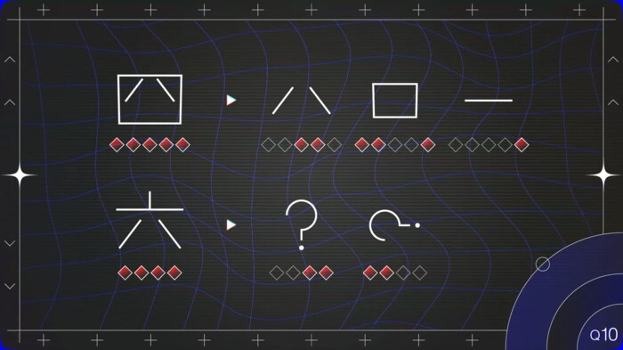 そうすると1つ目の「?」は「ハ」に。同じように2つ目の「?」も見ると1画目と2画目に色がついていて、文字を縦にすると「ト」になります。