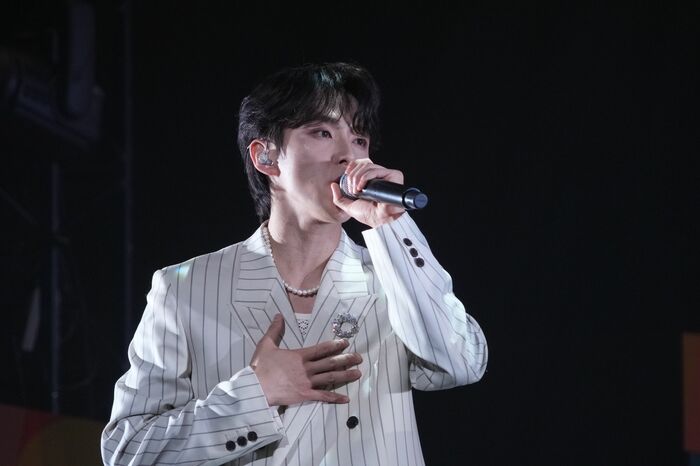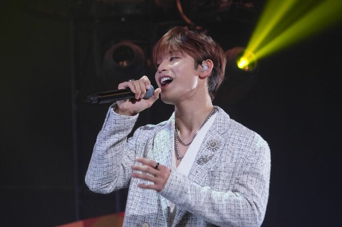 続いては、JO1の河野さんと與那城さんの特別ユニットのライブ。スクリーンに2020年の『めざましテレビ』にJO1が初登場した際の映像、河野さんと與那城さんの名場面集が流れます。2人が食レポに挑戦するシーンでは笑い声が漏れ、今回のライブへの意気込み映像に大きな拍手が起こり、登場への期待感が最高に高まったところで、河野さんと與那城さんが白い衣装で登場すると割れんばかりの歓声が。