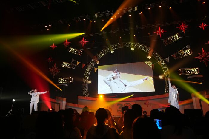 そして、「新しいことを始める人を応援できたらいいな、挑戦し続ける人のために歌を」と、ギタリストの外園一馬さんを呼び込み、アコースティックバージョンの『Your Key』を披露。伸びやかな歌声と抜群のハーモニーを会場に届けました。ロマンティックなバラード『Romance』では、ラップパートの低いトーンとクリアなハイトーンボイスを使い分けて情感たっぷりに歌い上げた2人。