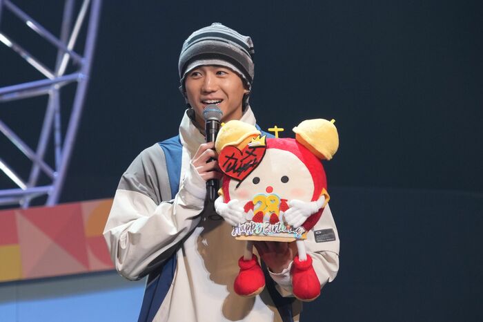 ライブ後のトークパートでは、世界さんの実家の犬が『きょうのわんこ』に出演したことがあり、家に撮影が来たという秘話が披露されたり、3月11日に誕生日を迎えた瀬口黎弥さんにめざましくんぬいぐるみ(大)がサプライズでプレゼントされたりと、和やかなムードに包まれました。