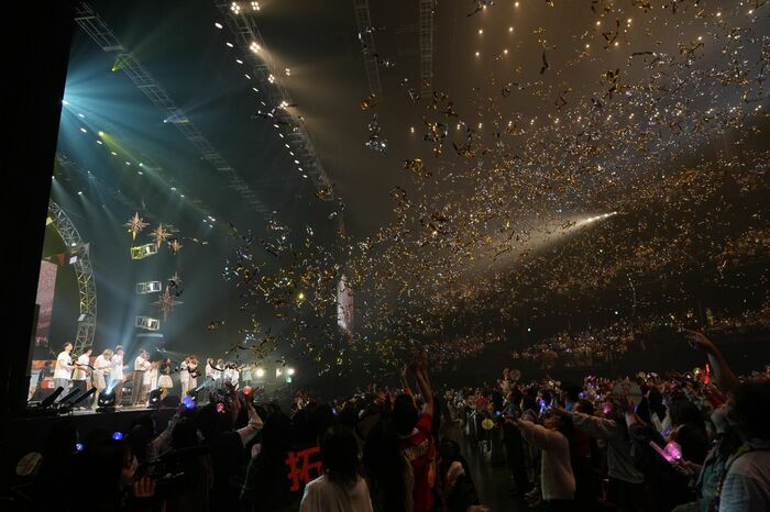 出演アーティストがステージに集合し、今日の感想を熱く語ったあとは、観客をバックに集合写真撮影タイムへ。1組ずつ手を振ってステージから去っていくアーティストたちを見送り、ステージに残ったキャスター陣から観客へのメッセージが伝えられます。