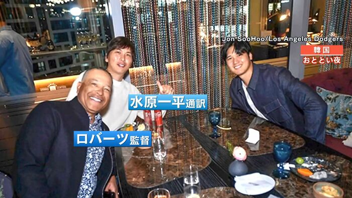 他にも大谷選手と通訳の水原一平さん、さらにはロバーツ監督とテーブルを囲む様子。