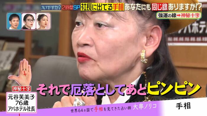 手相占いは続き、大串さんは「“神秘十字”の線があり、強運」と鑑定。元谷さんは、未熟児で産まれながらも生き延びたことや、福井地震で幸運にも助かったことを明かし、「それで厄落としてあとピンピン」と言葉に力を込めました。