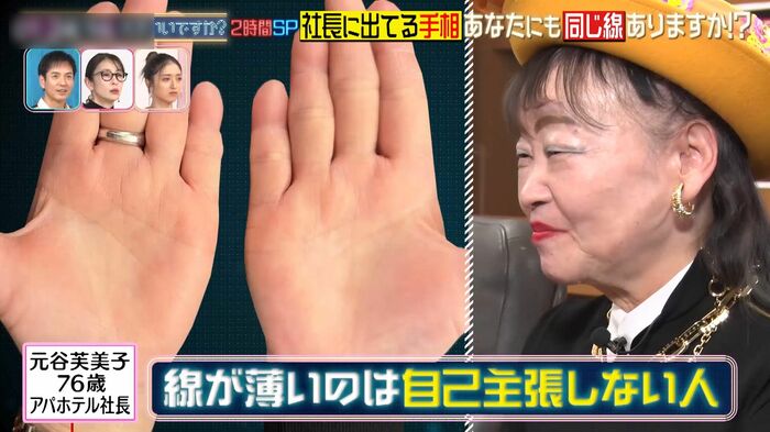 さらに元谷さんは、社長の手に共通する2つの特徴「手が分厚い」「生命線が外に張り出している」を満たしているだけでなく、生命線が二股に分かれており、「生命力が2倍」だそう。元谷さんは「90歳までミニスカートで頑張れたら100点!」と話しました。