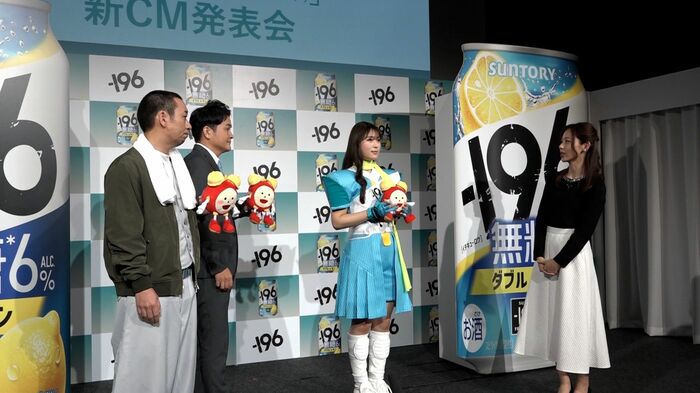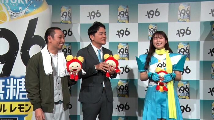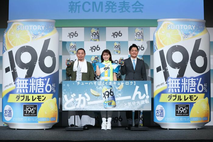 渋谷凪咲さんと千鳥が3月14日、サントリーチュウハイ「-196(イチキュウロク)」新CM発表会に出席しました。