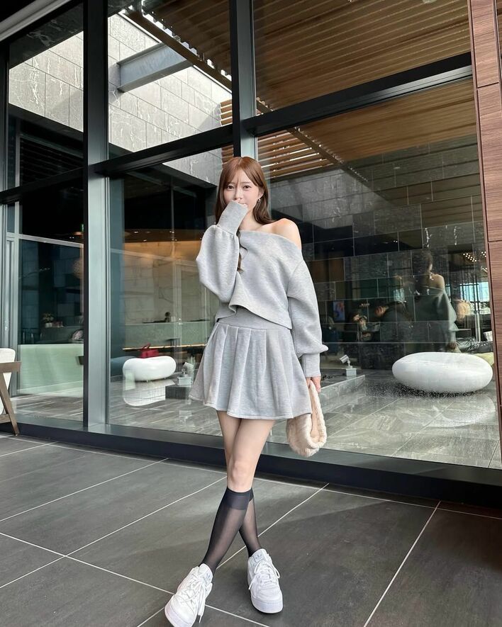 松川さんは、美デコルテがあらわになったワンショルダーのトップスに、ミニスカートでスラッとした美脚が際立ったグレーのセットアップコーデを披露。