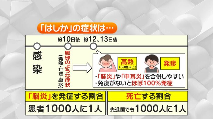 感染するとまず発熱やせき、鼻水といったかぜのような症状が。熱が2~3日続いた後、39度以上の高熱と発疹が現れます。さらに、患者の1000人に1人は重症化し脳炎になる可能性も。