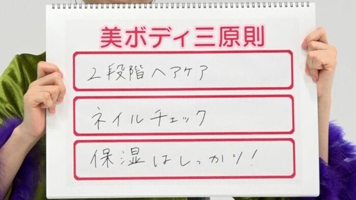 来栖りんさんの美Body三原則は、①「2段階ヘアケア」、②「ネイルチェック」、③「保湿はしっかり」。それぞれ詳しく聞いていきます。