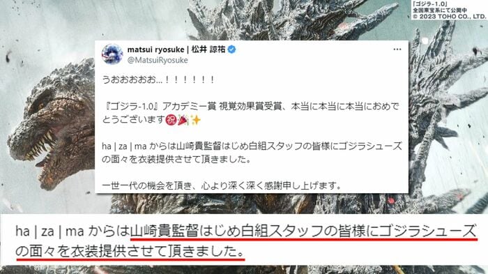 『山崎貴監督はじめ白組スタッフの皆様にゴジラシューズの面々を衣装提供させて頂きました。