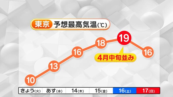 3月16日(土)には19℃と、4月中旬並みの気温まで急上昇する予想です。(12日午前7時時点)