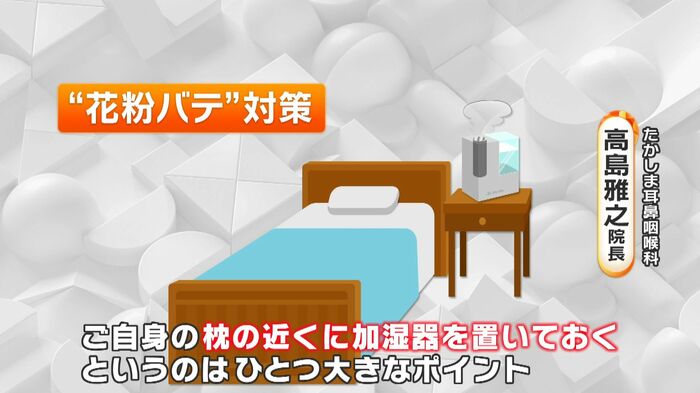 たかしま耳鼻咽喉科 高島雅之院長によると、枕の近くに加湿器を置くと花粉が床に落ちやすくなるため、対策としては大きなポイントになるということです。