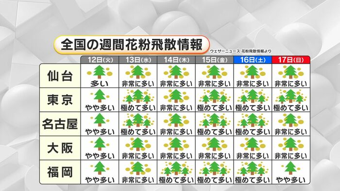 またウェザーニュースの週間花粉飛散情報によると、3月13日(水)以降は3月16日(土)まで、仙台、東京、名古屋、大阪、福岡の5都市すべてで「非常に多い」や「極めて多い」となっていて、3月11日の週はまさに“花粉最強週間”になりそうです。